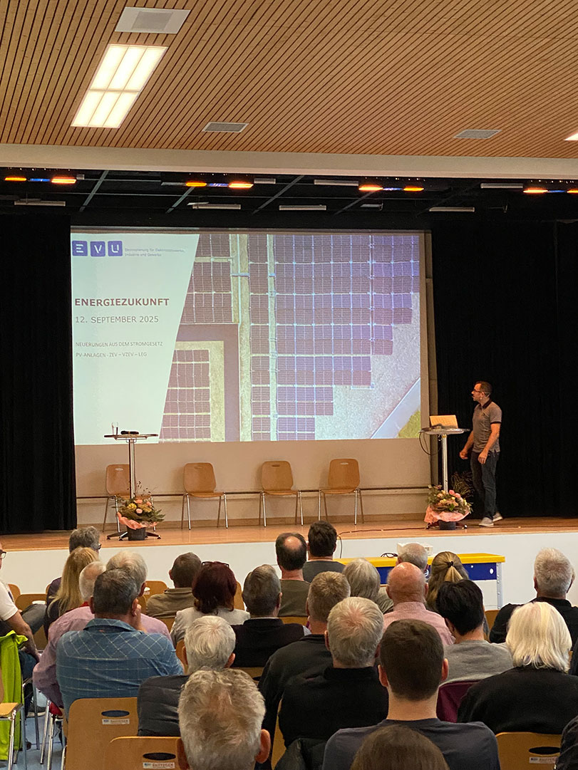 Den Auftakt machen durte die EVU-Beratung AG, vertreten durch Markus Wallier, mit einem Referat zu den Änderungen im Energie- und Stromgesetz. Im Fokus standen Themen wie die Solidarisierung von Netzverstärkungen, die Abnahme- und Vergütungspflicht mit neuer Mindestvergütung, die garantierte Nutzung von Flexibilitäten, der virtuelle Zusammenschluss zum Eigenverbrauch (vZEV) sowie die ab 2026 mögliche Lokale Elektrizitäts-Gemeinschaft (LEG) als neues Modell für PV-Produzenten, welche eine Art Hofladen für Photovoltaik-Produzenten darstellt.